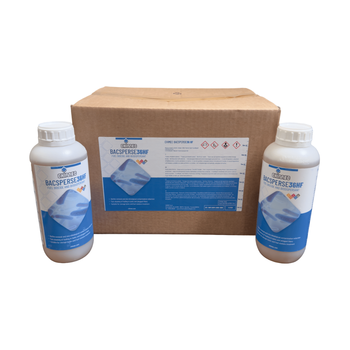 Biocida Chimec Bacsperse 36 contro la proliferazione batterica che causa la formazione di depositi nei serbatoi di stoccaggio, la crescita di film biologici e il conseguente intasamento dei filtri sui motori e sulle cisterne.